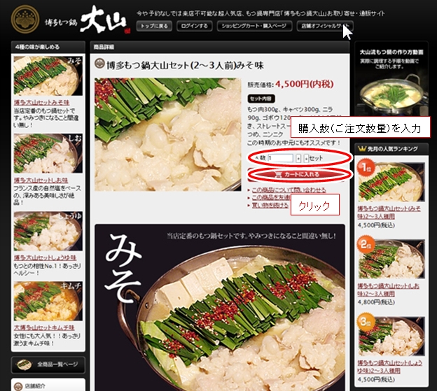 下記は、もつ鍋みそ味セット、追加のもつ肉のみ、追加のちゃんぽん麺をご注文の場合の例です。